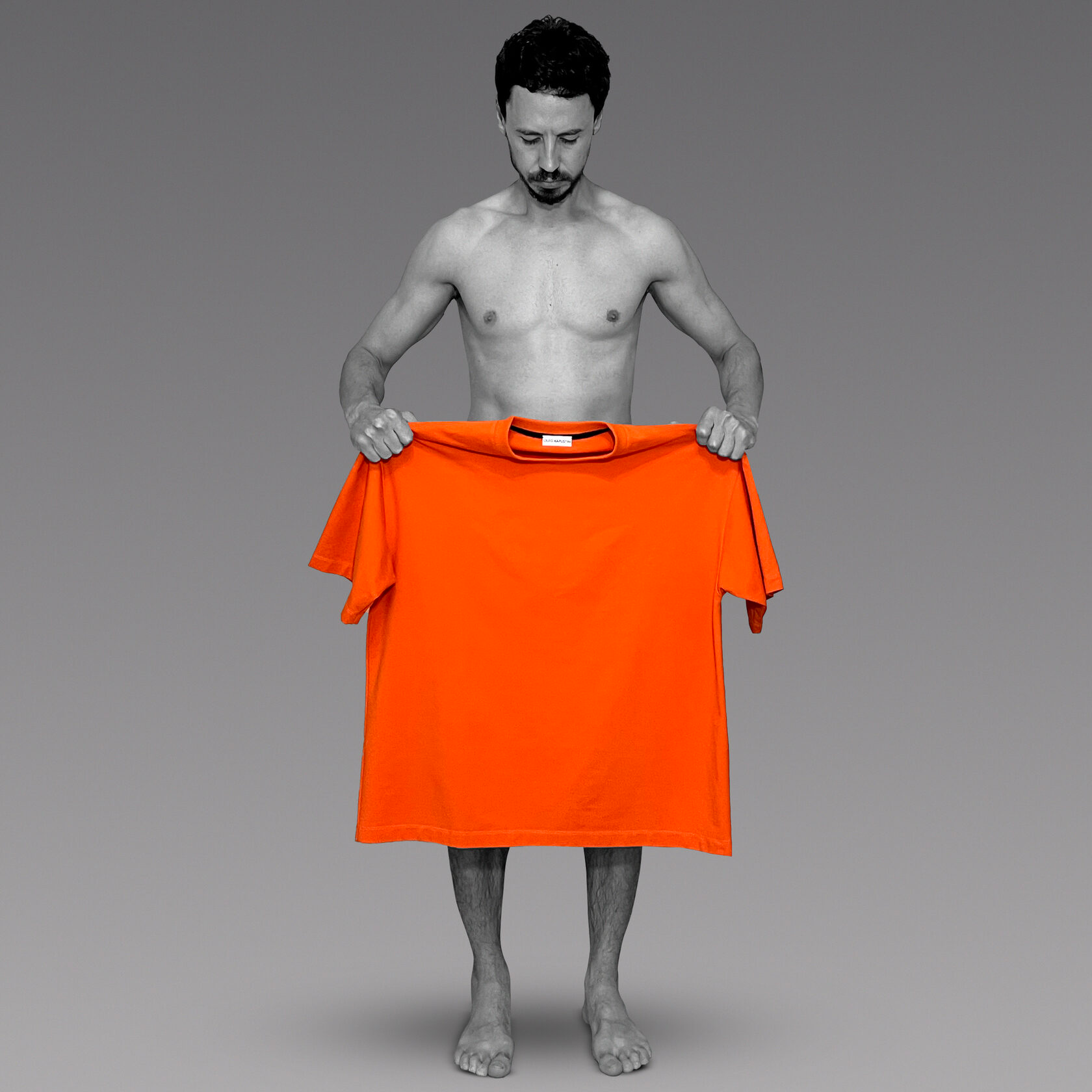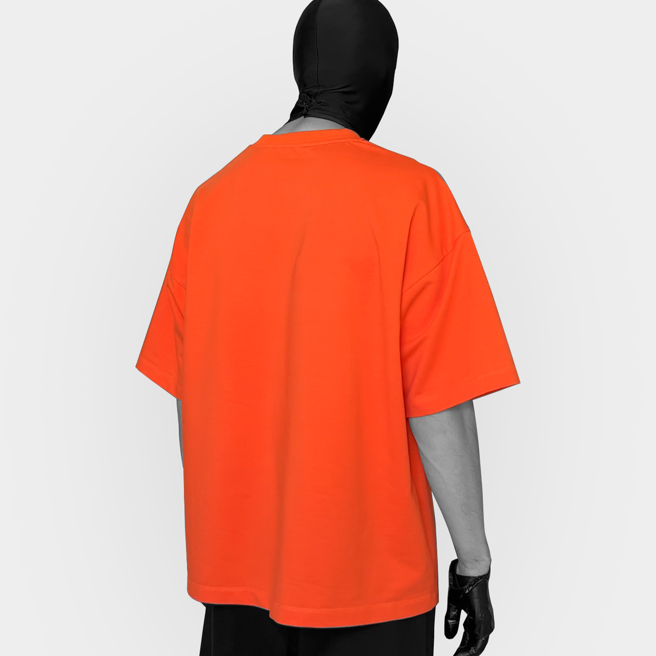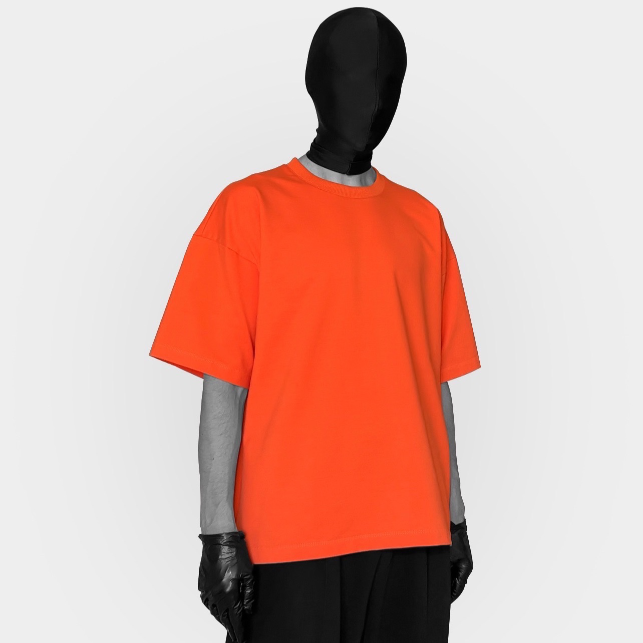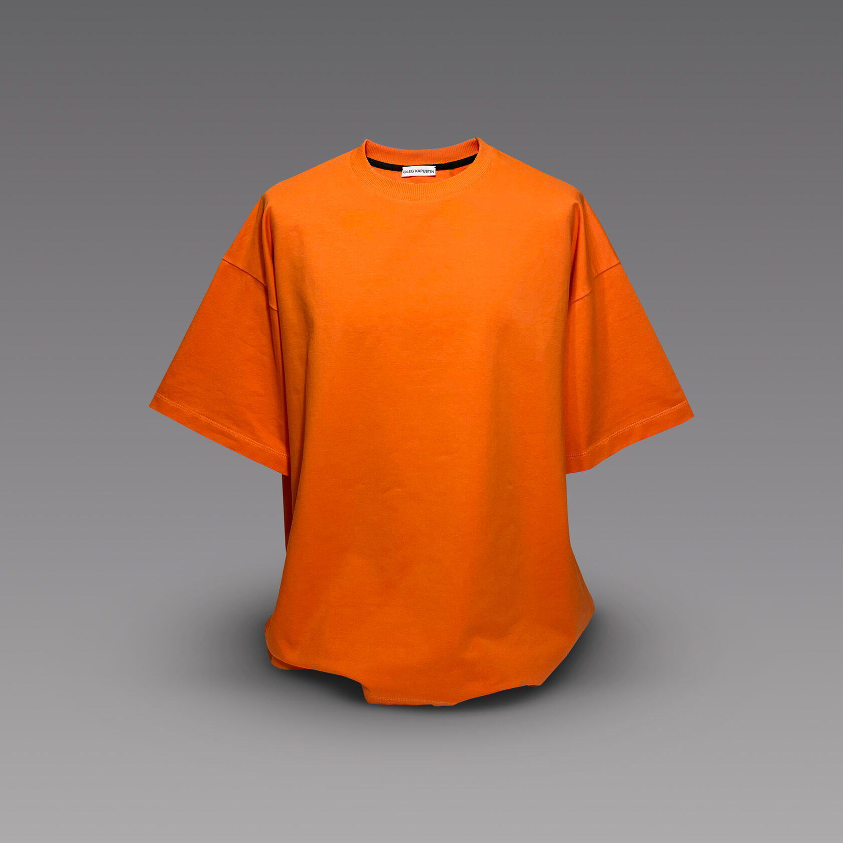 На модели размер М. Параметры изделия размера М: рост 176-180 см, обхват груди 128 см, длина рукава от горловины 46 см, длина изделия 75 см. Цвет: оранжевый Состав: 98% хлопок, 2% эластан Размер: М