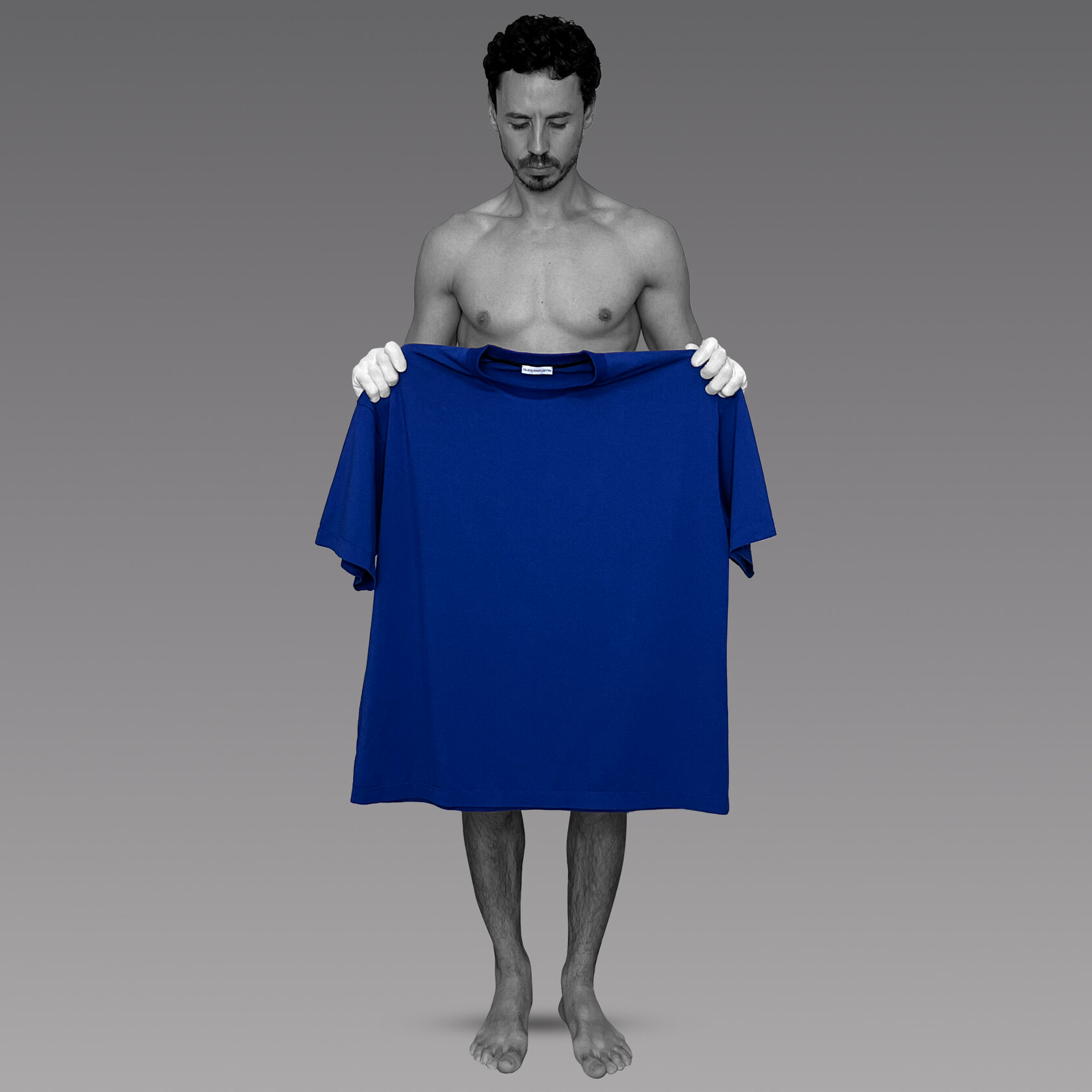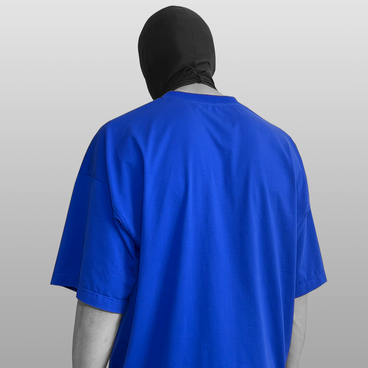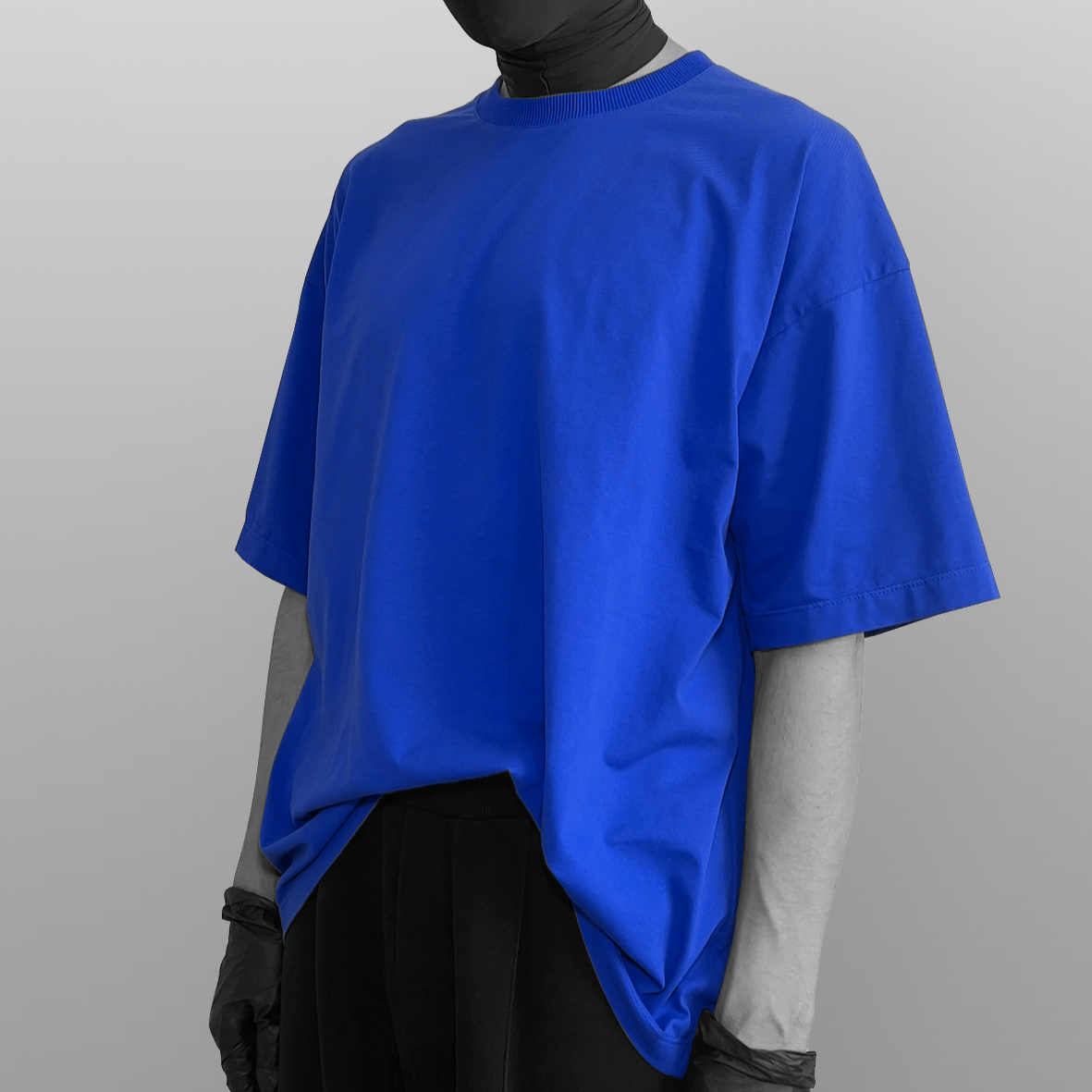 На модели размер М. Параметры изделия размера М: рост 176-180 см, обхват груди 128 см, длина рукава от горловины 46 см, длина изделия 75 см. Цвет: синий Состав: 98% хлопок, 2% эластан Размер: М
